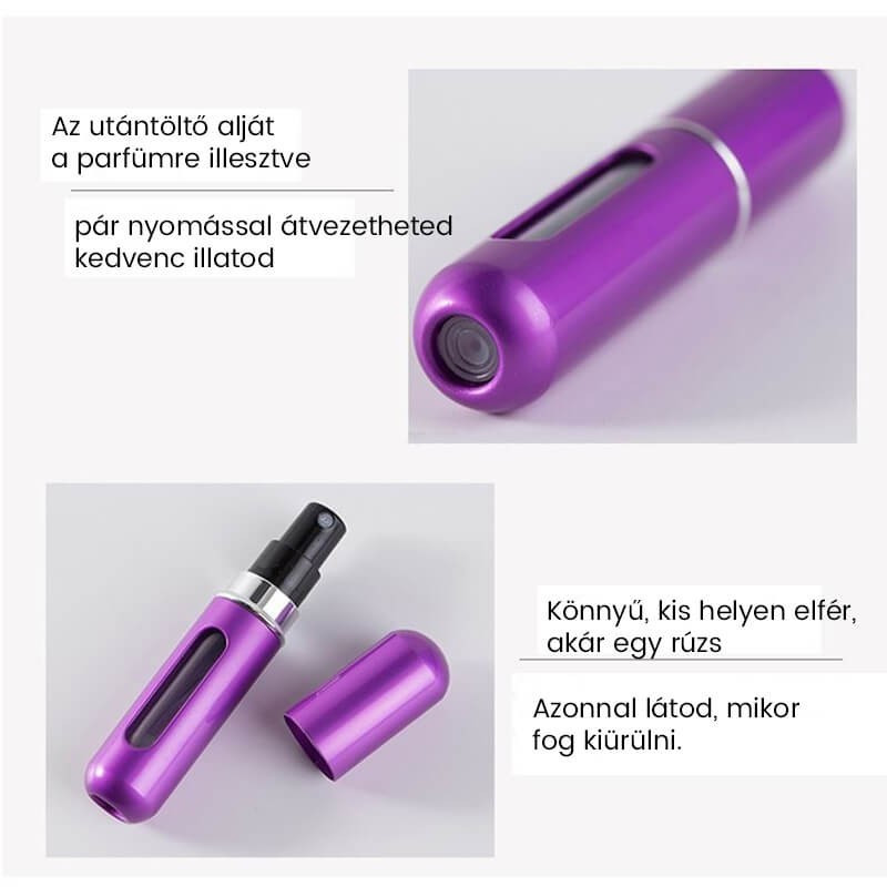Datorită dimensiunii sale mici, pulverizatorul de parfum reîncărcabil încape în orice geantă. Este ideal pentru călătorii, mai ales dacă zbori cu avionul, deoarece acolo îți pot impune cât lichid poți avea în bagajul de mână!