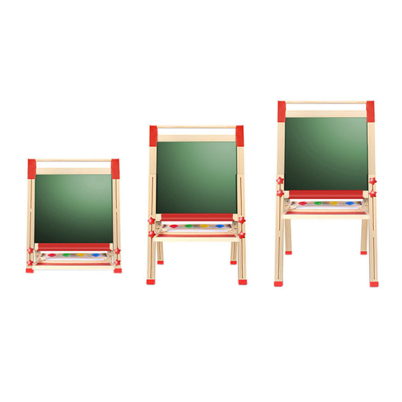 Tabla de joc cu înălțime reglabilă are 2 suprafețe din materiale diferite. Una dintre ele este o tablă tradițională de cretă, pe care copiii pot exersa alfabetul, adunările sau își pot dezvolta creativitatea cu cretă colorată. Cealaltă parte a tablei este o suprafață albă magnetică, pe care cei mici pot scrie cu marker. Setul include 4 suporturi colorate pentru markere și o rolă de hârtie care poate fi fixată cu clema de pe tablă.