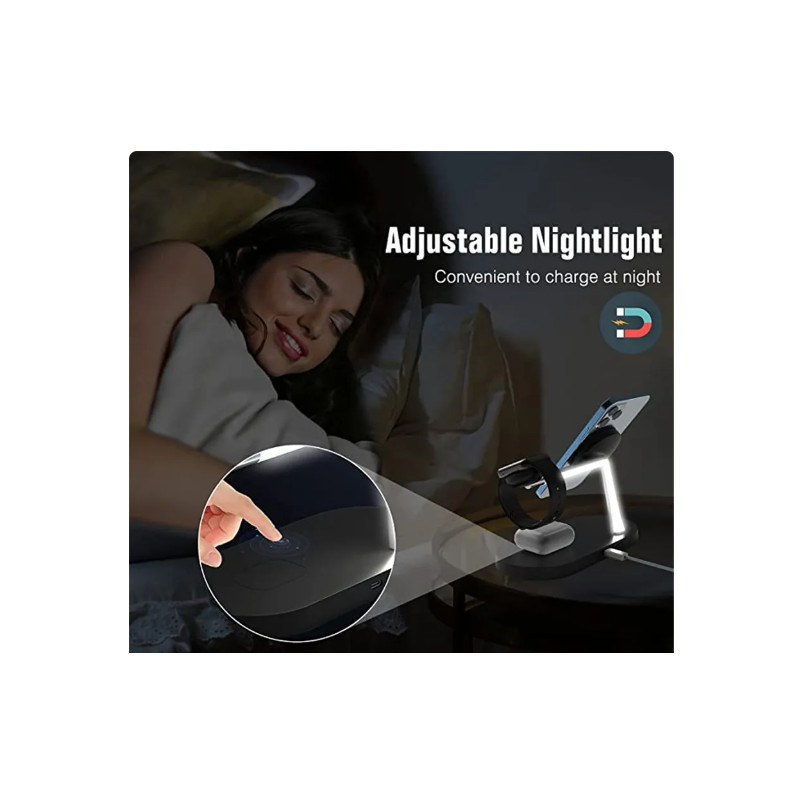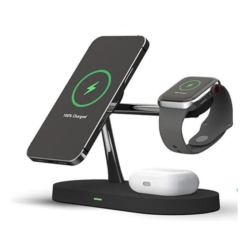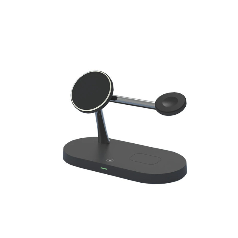 Avem o soluție pentru tine! Acest suport de încărcare magnetic wireless 3 în 1 este alegerea perfectă pentru a-ți încărca cu ușurință dispozitivele. Produsul este ușor de transportat oriunde. Este compatibil cu iPhone de la 12 până la 13, precum și cu AirPods și Apple Watch.