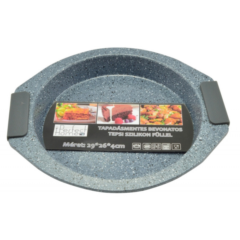 Tavă din oțel cu înveliș antiaderent și mâner din silicon, ideală pentru coacerea prăjiturilor mici, lasagna, cartofi și altele. Materialul tăvii este ușor de curățat cu apă caldă și detergent și se poate spăla și în mașina de spălat vase. Înainte de prima utilizare și după fiecare utilizare, este necesar să o cureți bine și să o ștergi uscată. Este important să nu tai învelișul, deoarece acest lucru poate deteriora suprafața tăvii. În timpul coacerii și gătitului, se recomandă utilizarea ustensilelor din lemn, plastic sau silicon, deoarece ustensilele din metal pot zgâria învelișul. Tava este potrivită pentru utilizare în cuptoare pe gaz și electrice. Dimensiunile produsului: 26,6 cm diametru exterior, 21 cm diametru interior, 3,5 cm înălțime, 29,3 cm lățime cu mânerele incluse. Greutatea produsului este de 345 g.