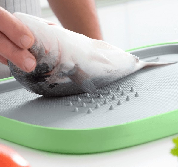 Această placă de tăiat îți permite să tai cu ușurință, fiind antiderapantă și având puncte centrale de fixare, astfel încât mâncarea nu alunecă și nu te tai accidental. În plus, este divizibilă, un capăt servind ca răzătoare și fiind detașabil, ceea ce o face foarte utilă pentru a adăuga cu ușurință alimentele tăiate sau rase în oală sau tigaie. Placa de tăiat este reversibilă, putând fi folosită pe ambele părți. Marginea ridicată previne scurgerile, fiind perfectă pentru dezghețarea alimentelor fără a vărsa apă pe blatul de bucătărie. Se curăță ușor și este compatibilă cu mașina de spălat vase.