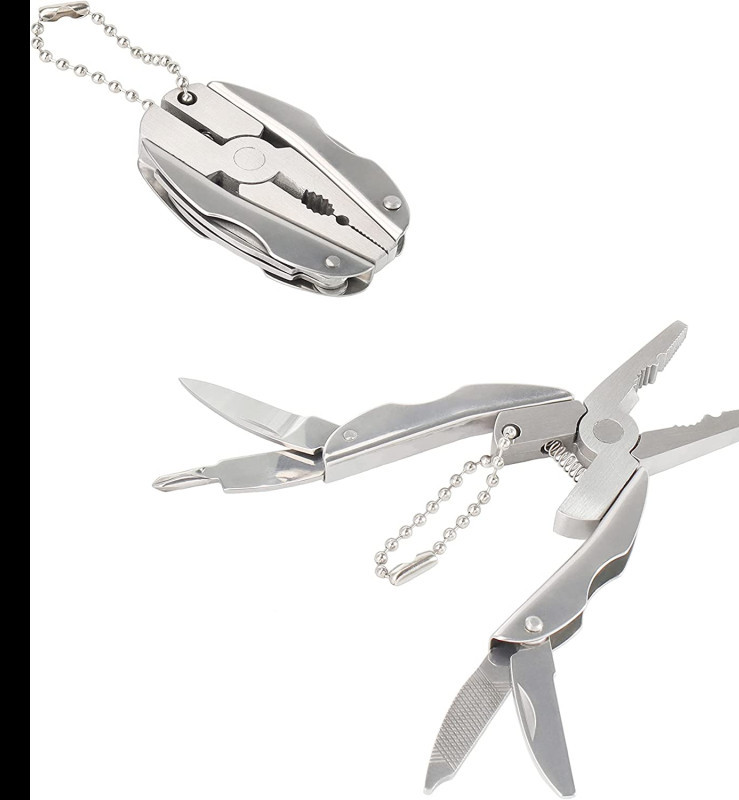 Setul multifuncțional 6 în 1 cu ciocan din oțel, șurubelniță, pilă, clește, cuțit cu lamă și foarfece combină cele mai utilizate unelte într-un design ușor și durabil din oțel inoxidabil. Designul integrat permite plierea uneltelor, economisind astfel spațiu în trusa de scule și permițându-ți să le porți cu ușurință pe breloc sau în buzunar.