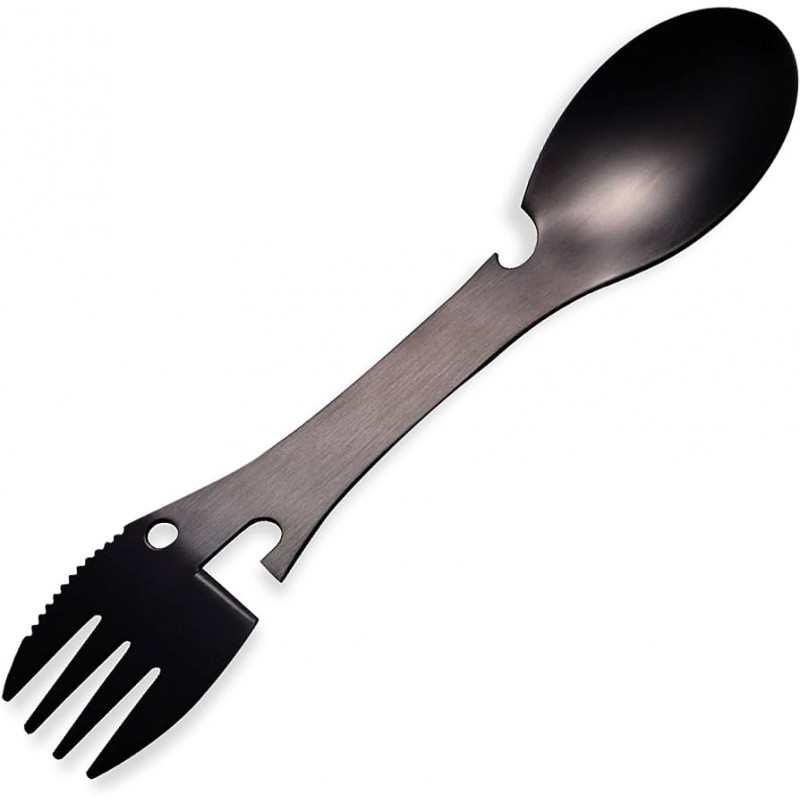 Descoperă practicitatea eternă a setului de tacâmuri de călătorie 5 în 1, care reunește într-un singur instrument funcțiile de lingură, furculiță, cuțit, deschizător de conserve și deschizător de sticle.