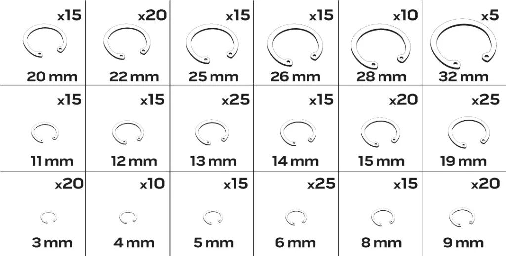 Set de inele de siguranță NEO, 300 bucăți: inele Seeger de diferite dimensiuni, inclusiv 20 x 3 mm, 10 x 4 mm, 15 x 5 mm, 25 x 6 mm, 15 x 8 mm, 20 x 9 mm, 15 x 11 mm, 15 x 12 mm, 25 x 13 mm, 15 x 14 mm, 20 x 15 mm, 25 x 19 mm, 15 x 20 mm, 20 x 22 mm, 15 x 25 mm, 15 x 26 mm, 10 x 28 mm, 5 x 32 mm.