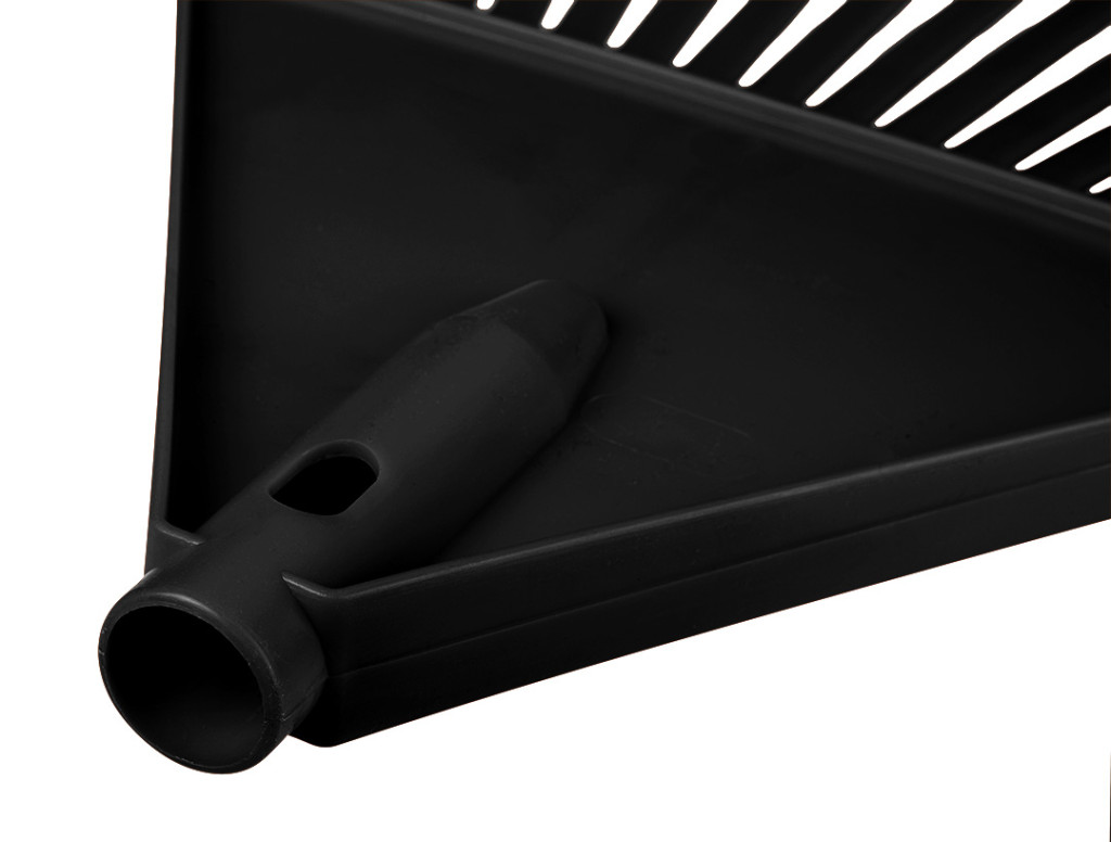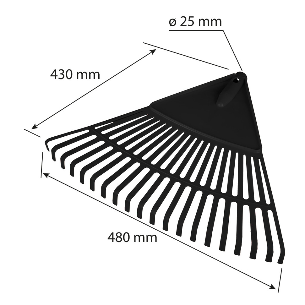 VERTO 15G085 greblă pentru frunze, cu o lățime de 480 mm și o lungime de 430 mm. Diametrul orificiului pentru fixarea mânerului este de 25 mm, iar diametrul recomandat pentru mâner este de 23 mm. Fabricată din plastic negru reciclat. Ușoară și durabilă. Datorită conectorului său special, mânerul este interschimbabil cu alte unelte din sistem.