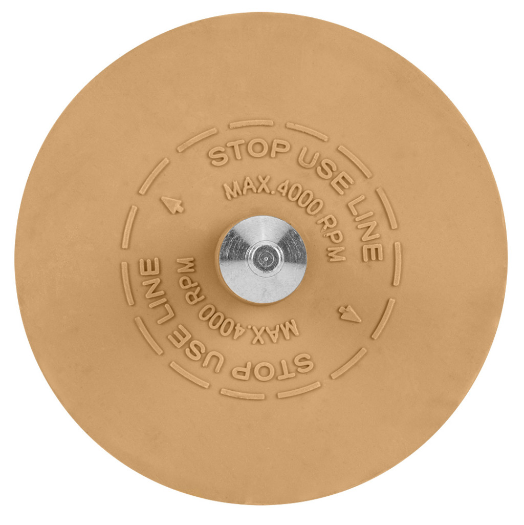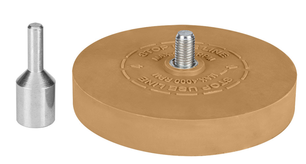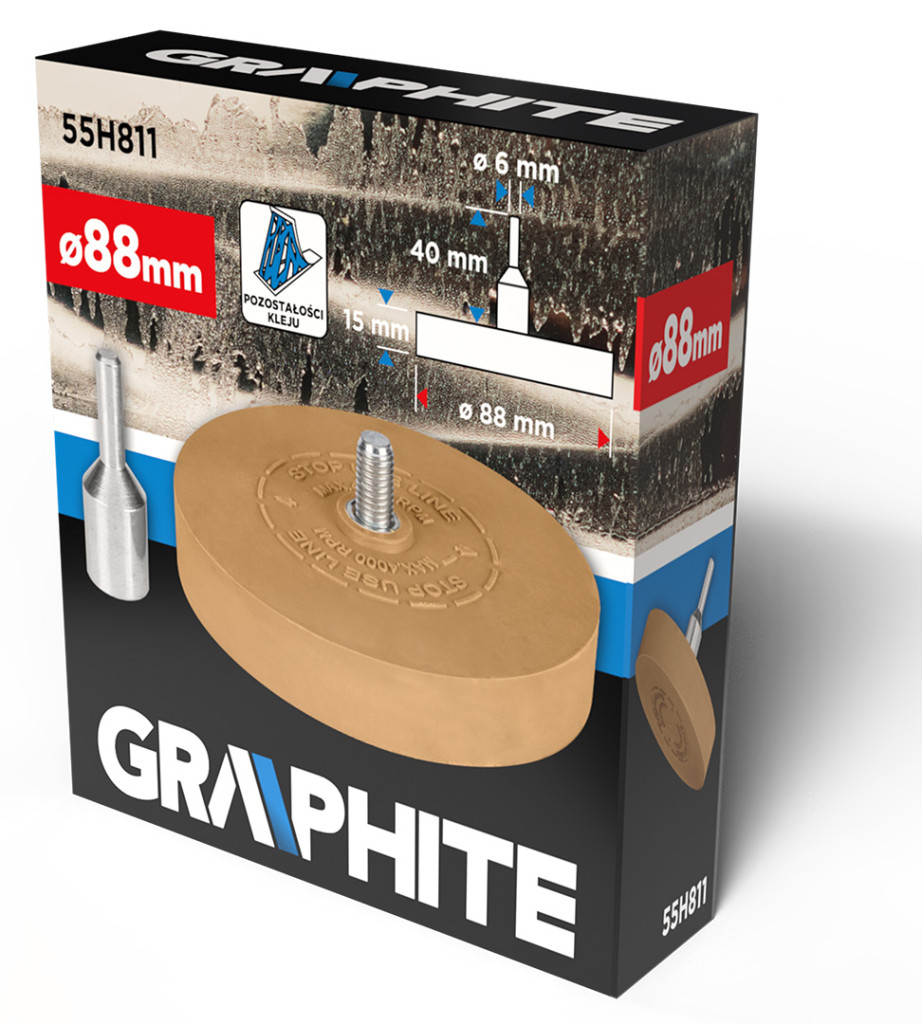 GRAPHITE 55H811 Disc pentru îndepărtarea adezivului, cu ax, 88 mm. Un instrument eficient, cu un diametru de 88 mm și o grosime de 15 mm, conceput pentru îndepărtarea profesională a autocolantelor și a reziduurilor de adeziv de pe caroseria mașinilor. Discul este fabricat din cauciuc robust, dar moale, care nu zgârie suprafața. Viteza maximă de rotație este de 4000 rotații/minut. Ideal pentru aplicații auto și altele.