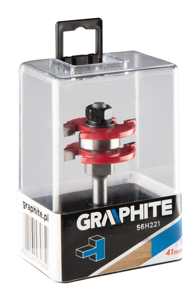 Freza dublă pentru caneluri, HM, 41 x 6,35 mm, tija de 8 mm GRAPHITE (cikkszám: 56H221). Proiectată pentru prelucrarea precisă a lemnului, PVC-ului și plăcilor aglomerate. Capul frezei este sinterizat și are o lamă tăietoare din carbură de tungsten. Este echipată cu rulmenți, ceea ce facilitează ghidarea frezei. Dimensiunile piesei de lucru sunt: diametru 41 mm, înălțime 6,35 mm; diametrul tijei este de 8 mm.