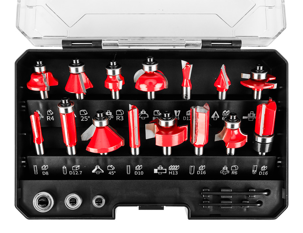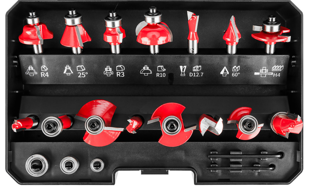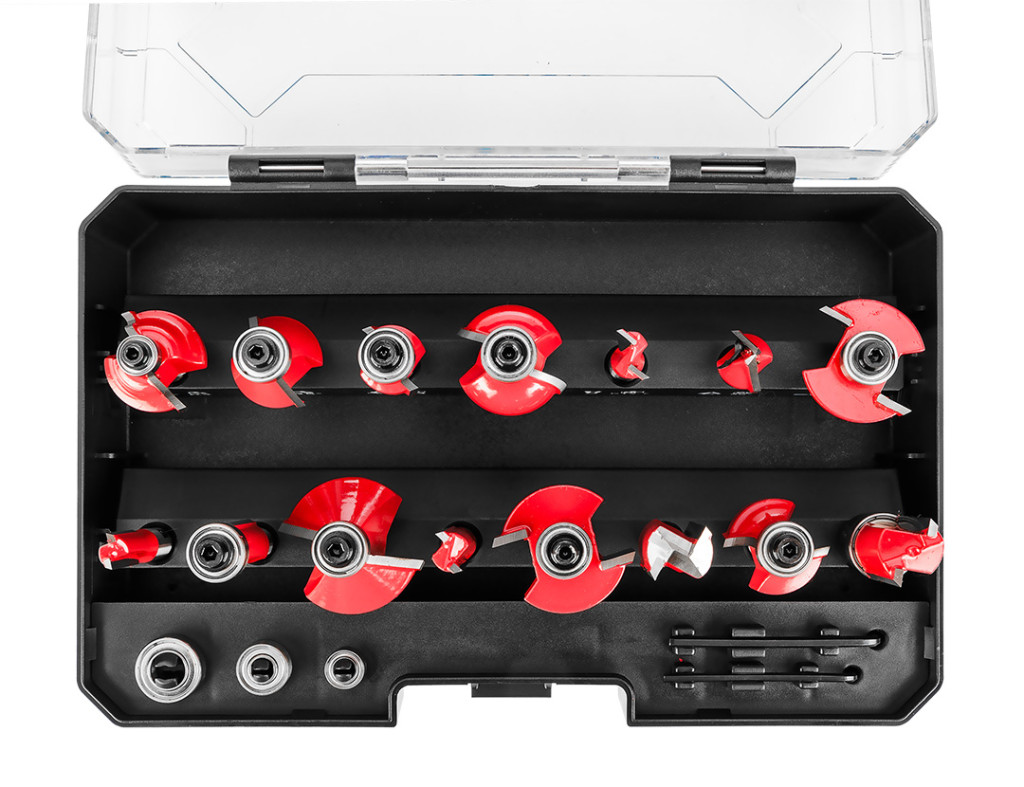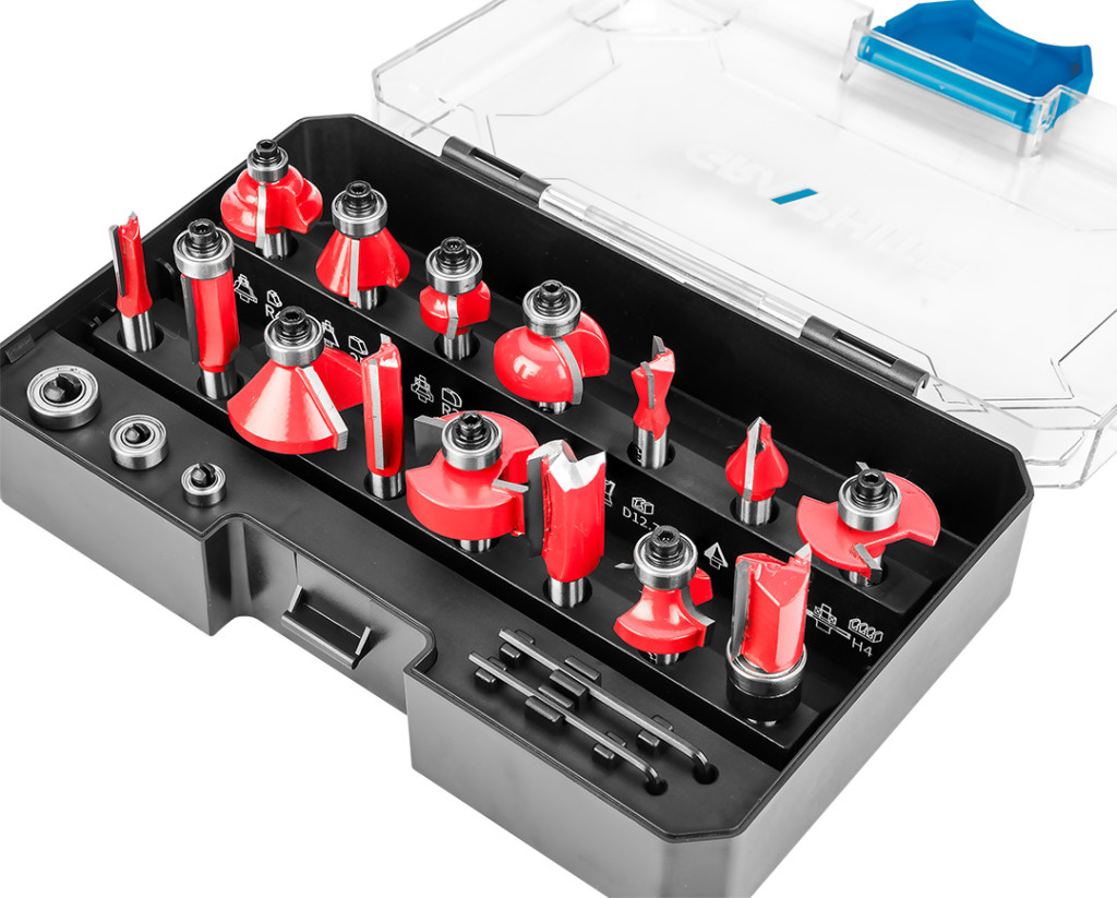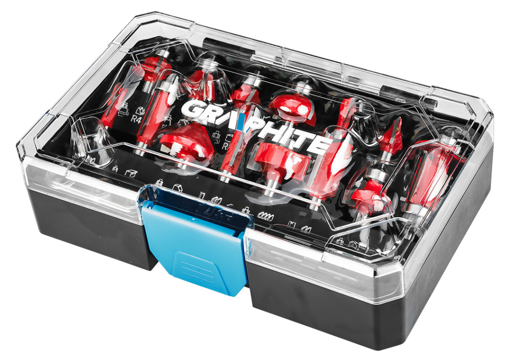GRAPHITE 56H241 Set de freze, cu coadă de 8 mm. Set de 15 piese, proiectat pentru prelucrarea lemnului, placajului, PVC-ului și a plăcilor aglomerate. Fabricat din carbură durabilă și rezistentă la uzură (lamă) și TCT, acest instrument esențial poate fi folosit pentru o perioadă îndelungată.