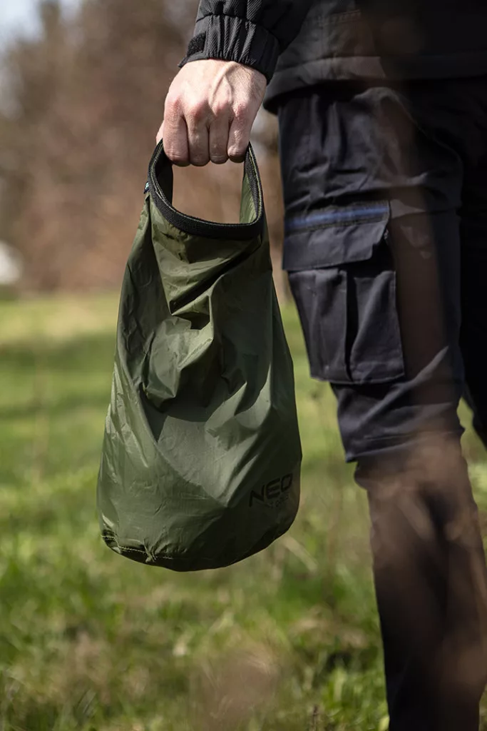A NEO TOOLS (cikkszám: 63-169) rucsac impermeabil de 5 litri, fabricat din nailon 40D, cu o rezistență la apă de 3000 mm PU. Are un diametru de 16 cm și o înălțime maximă de 38 cm. Ușor și durabil. Datorită închiderii strânse cu rulare și cataramă, îți protejează conținutul de ploaie și umezeală. Rucsacul impermeabil NEO TOOLS va fi indispensabil în timpul expedițiilor pentru protecția documentelor, bijuteriilor, telefonului sau lenjeriei curate.