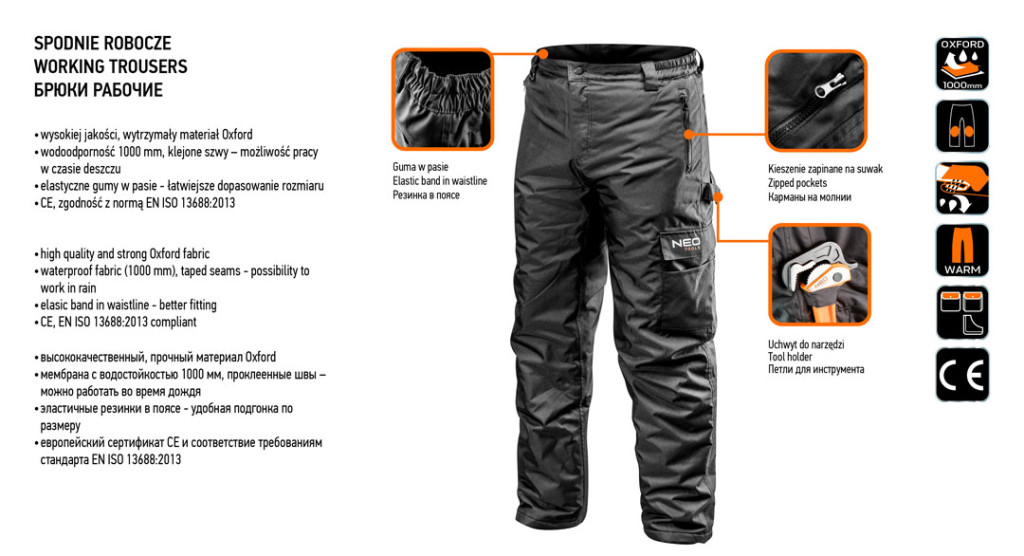 NEO Pantaloni de lucru căptușiți, confecționați din material Oxford 300D de înaltă calitate și durabil, cu o căptușeală ușoară din poliester, asigurând confort în zilele friguroase. Cusăturile întărite și materialul cu rezistență la apă de 1000 mm îți permit să lucrezi chiar și pe ploaie. Datorită taliei elastice, mărimea se adaptează mai ușor la forma corpului tău. Buzunarele sunt ușor accesibile și pot găzdui uneltele necesare în timpul lucrului. Suporturile pentru unelte rezistă la sarcini mari. Produsul este realizat conform standardului EN ISO 13688:2013 și certificarea europeană este garanția calității sale. Pantaloni de lucru, Oxford, mărime XL, material Oxford 300D, căptușeală din poliester, multe buzunare multifuncționale, suport pentru unelte, talie elastică, cusături întărite, rezistent la apă și vânt, extra izolat, certificat CE.