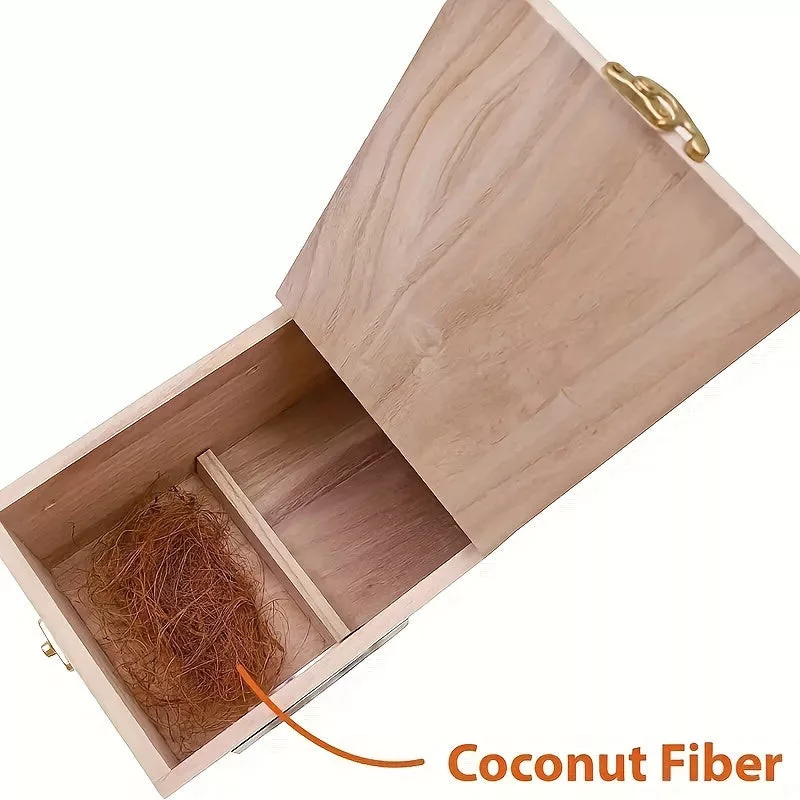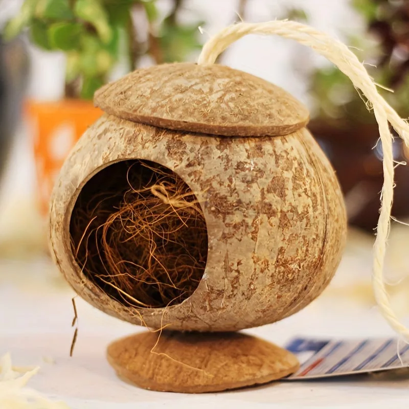 (Detalii de design) Designul cuibului este adaptat nevoilor păsărilor, asigurându-le confortul și protecția de care au nevoie. Fibrele din cocos asigură o ventilație naturală, care ajută la reglarea temperaturii interioare a cuibului. Se poate fixa ușor pe crengi de copaci sau alte suprafețe stabile, astfel încât păsările să se simtă în siguranță în timp ce se odihnesc sau își clocesc ouăle.