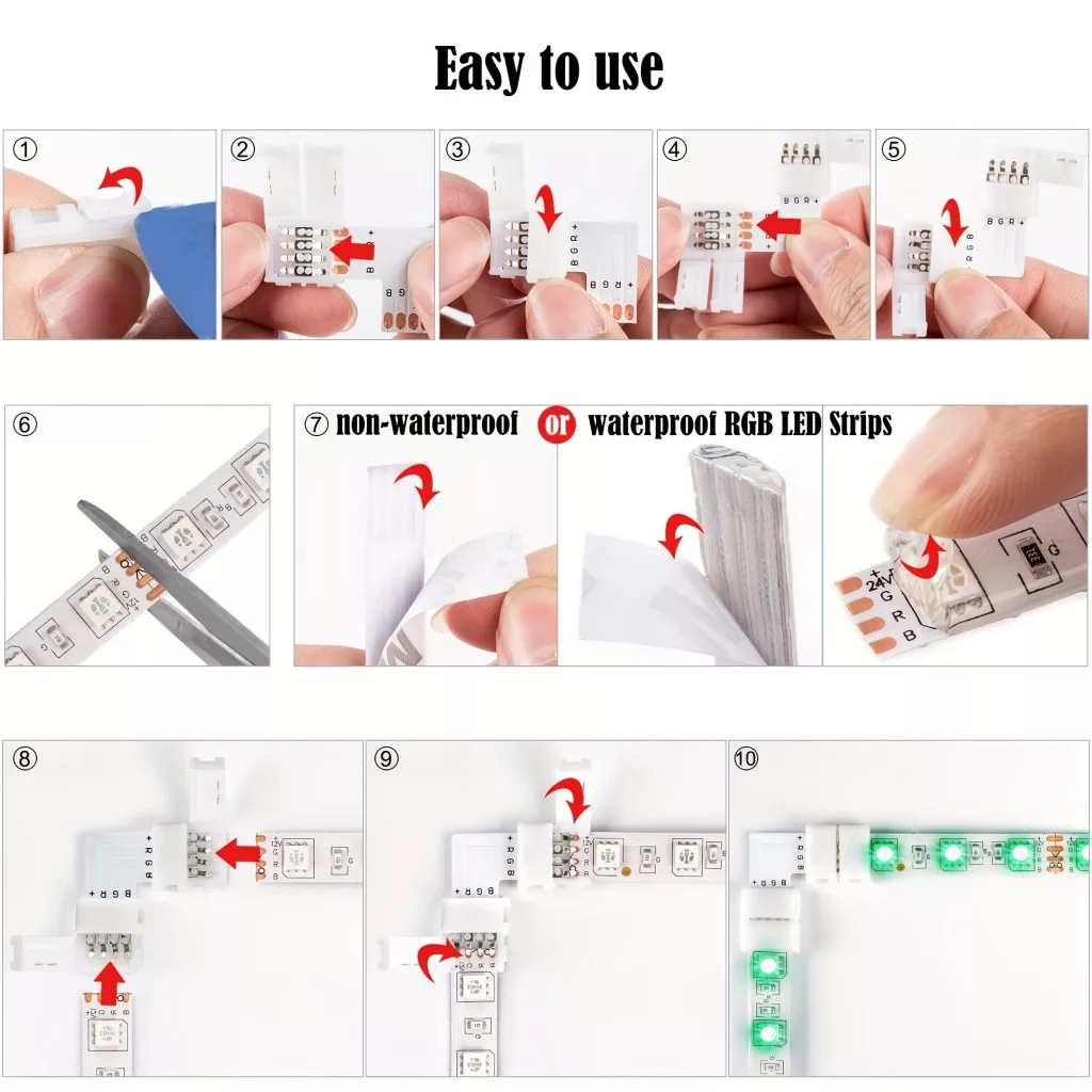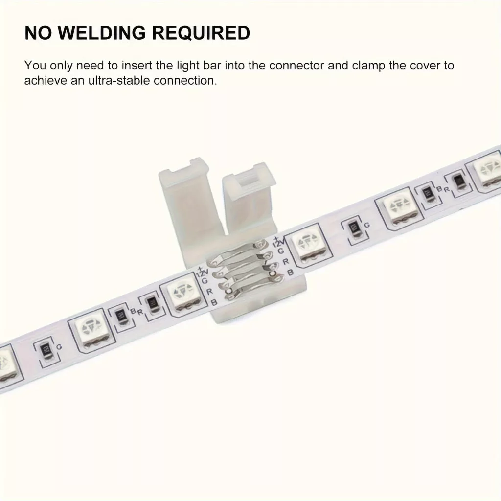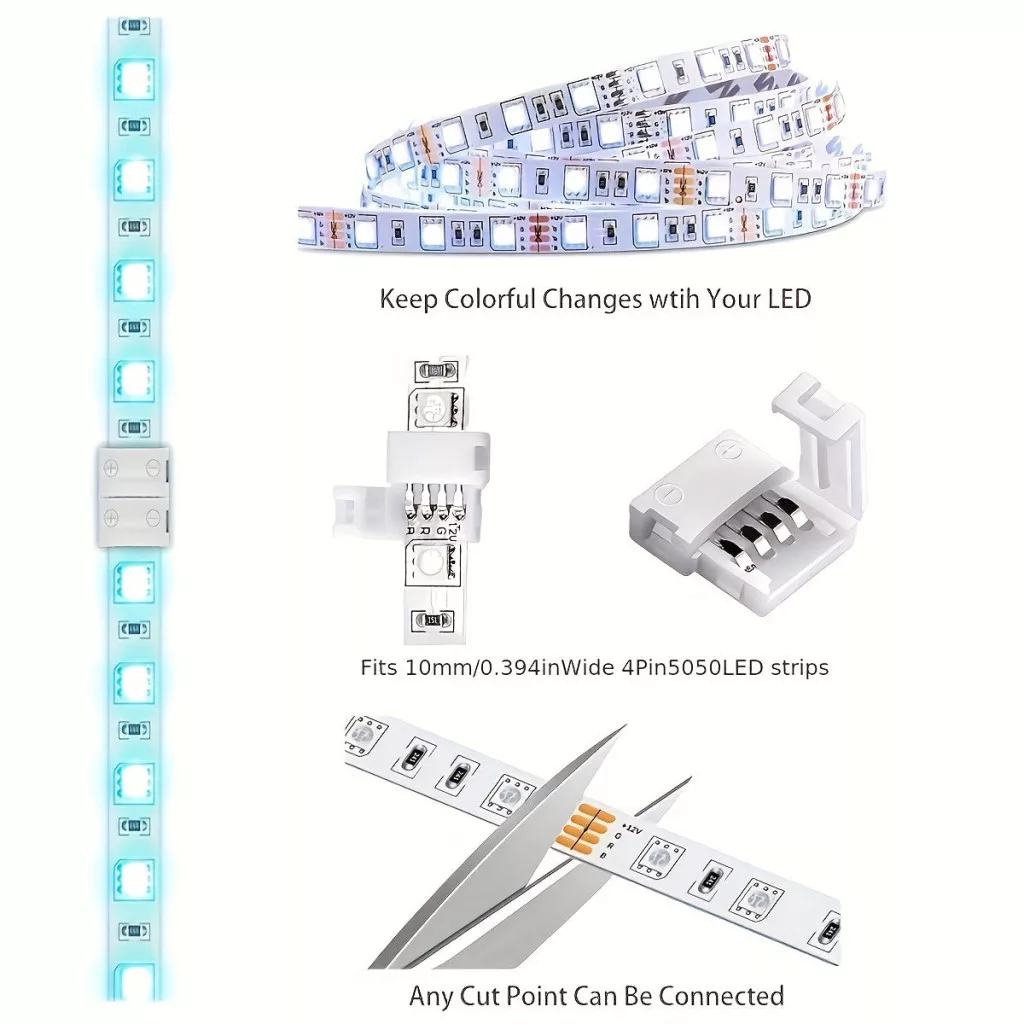 (Soluție de iluminat) Descoperă iluminarea uimitoare cu conectorul pentru bandă LED RGB cu 4 pini! Acest accesoriu practic îți permite să conectezi cu ușurință benzile LED fără a avea nevoie de lipire. Conectorul este simplu de utilizat, astfel încât chiar și începătorii se pot descurca cu el cu ușurință. Este alegerea perfectă pentru decorațiuni de acasă, petreceri sau orice eveniment unde vrei să aduci un plus de culoare și atmosferă. Datorită flexibilității sale, poate fi utilizat în orice încăpere, fie că e vorba de living, dormitor sau chiar bucătărie.