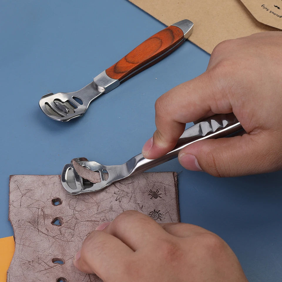 Instrumentul de tăiat piele din oțel inoxidabil este visul oricărui artizan al pielii. Acest cuțit profesional de tăiat piele este alegerea perfectă pentru cei care caută precizie și calitate la cel mai înalt nivel în munca lor. Datorită designului său ergonomic, se potrivește confortabil în mână, astfel încât să nu fie obositor chiar și în timpul utilizării îndelungate. Cu acest cuțit de tăiat piele, subțierea devine o joacă de copii, deoarece ascuțimea lamei și designul instrumentului permit lucrul cu cele mai fine detalii.
