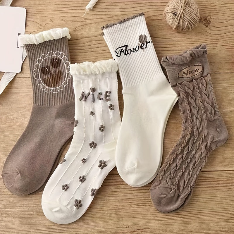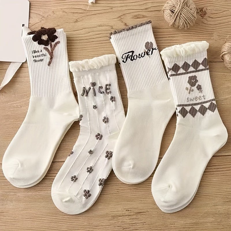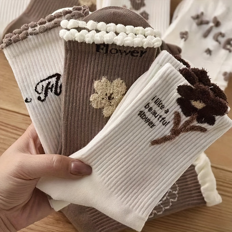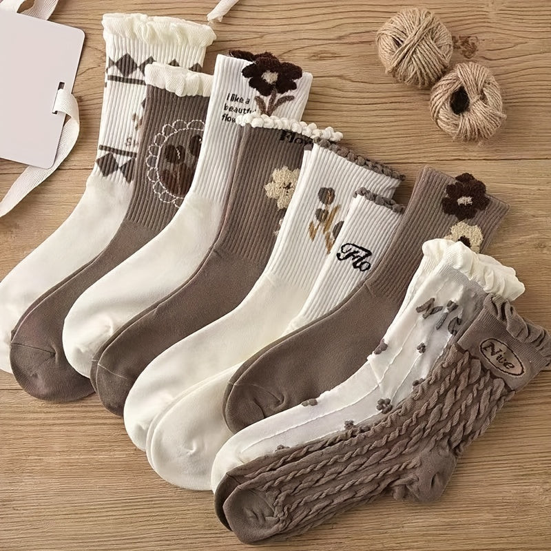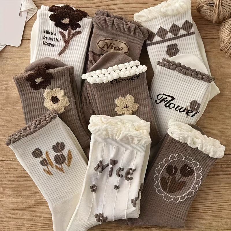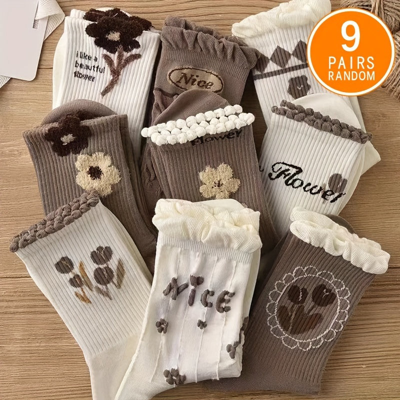 9 perechi de șosete de damă din bumbac cu model floral drăguț și margini confortabile rulante