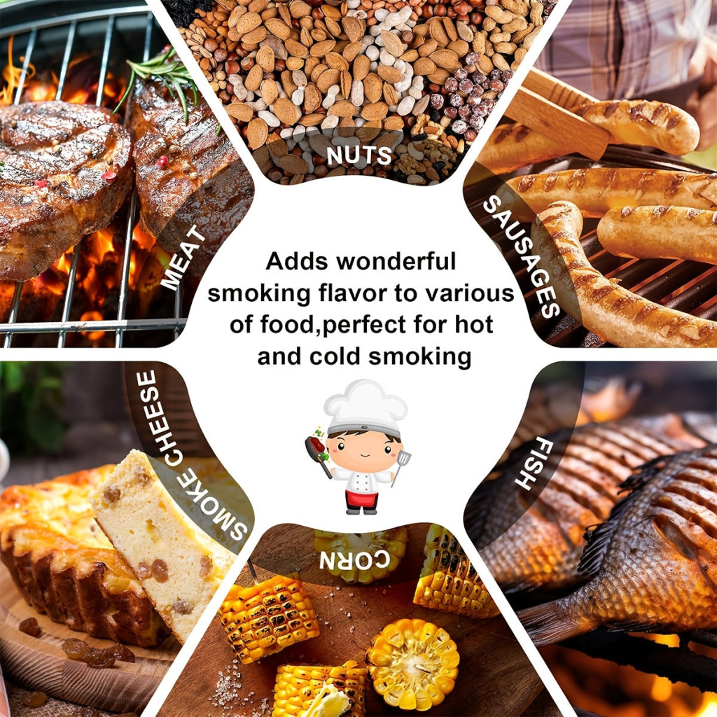 • Utilizare: Versatil, deoarece este potrivit pentru afumarea la rece a diferitelor alimente, fie că este vorba de carne, brânză sau legume.