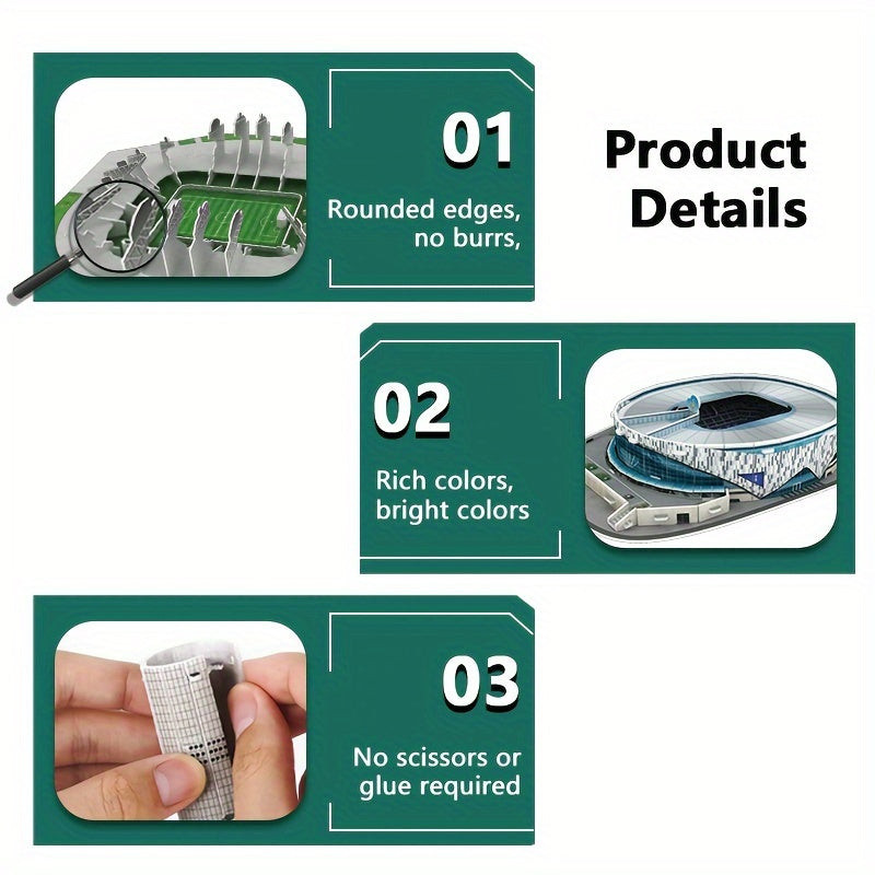 Descoperă o nouă dimensiune a creativității și distracției cu acest puzzle 3D uimitor din hârtie, în formă de stadion! Acest produs special nu este doar un simplu puzzle, ci o adevărată operă de artă creată pentru iubitorii de sport și arhitectură. Detaliile minuțios lucrate și aspectul realist garantează că piesa finalizată nu doar că va încânta privirea, dar te va umple și de mândrie. În timp ce asamblezi puzzle-ul, îți poți dezvolta îndemânarea și creativitatea, construind cu propriile mâini o miniatură a unui stadion iconic.