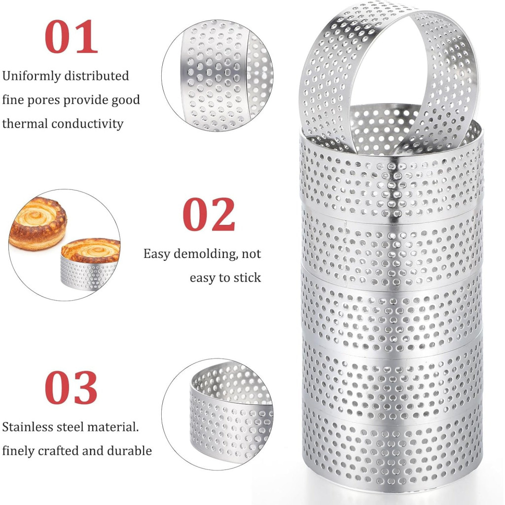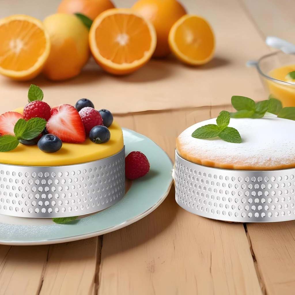 Descoperă o nouă dimensiune a coacerii cu inelele de susținere din oțel inoxidabil și formele rotunde perforate pentru tort! Aceste forme antiaderente de 2.36 inci sunt perfecte pentru a crea deserturi creative, fie că este vorba de nunți, Crăciun, Halloween sau Ziua Recunoștinței. Colecțiile de tăvi rezistente la căldură asigură că prăjiturile tale ies întotdeauna perfect, astfel încât să poți impresiona de fiecare dată. Datorită designului perforat, căldura se distribuie uniform, astfel încât prăjiturile se coc perfect și se desprind ușor din formă.