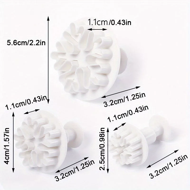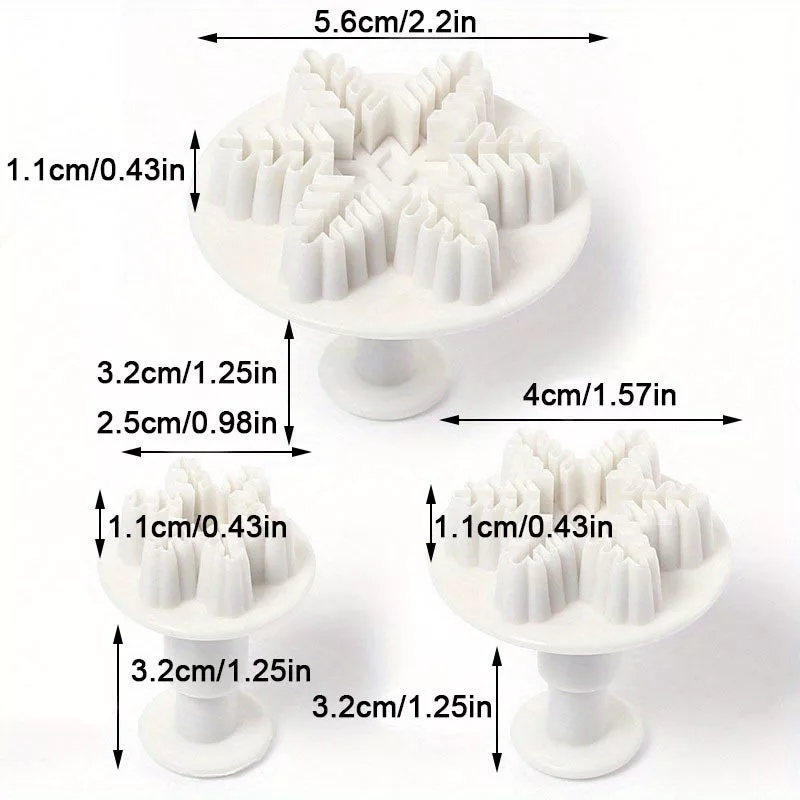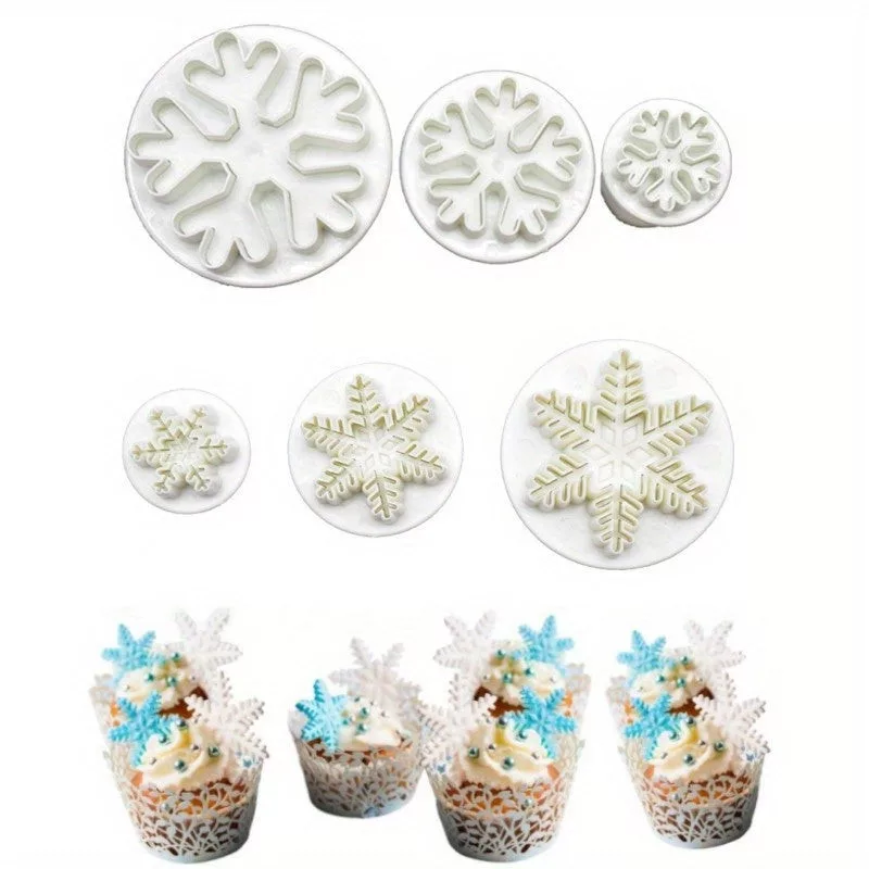 • (Proiectare) Forme în formă de fulg de zăpadă: Cu cele trei tăietoare în formă de fulg de zăpadă, de dimensiuni diferite, poți crea prăjituri variate și unice.