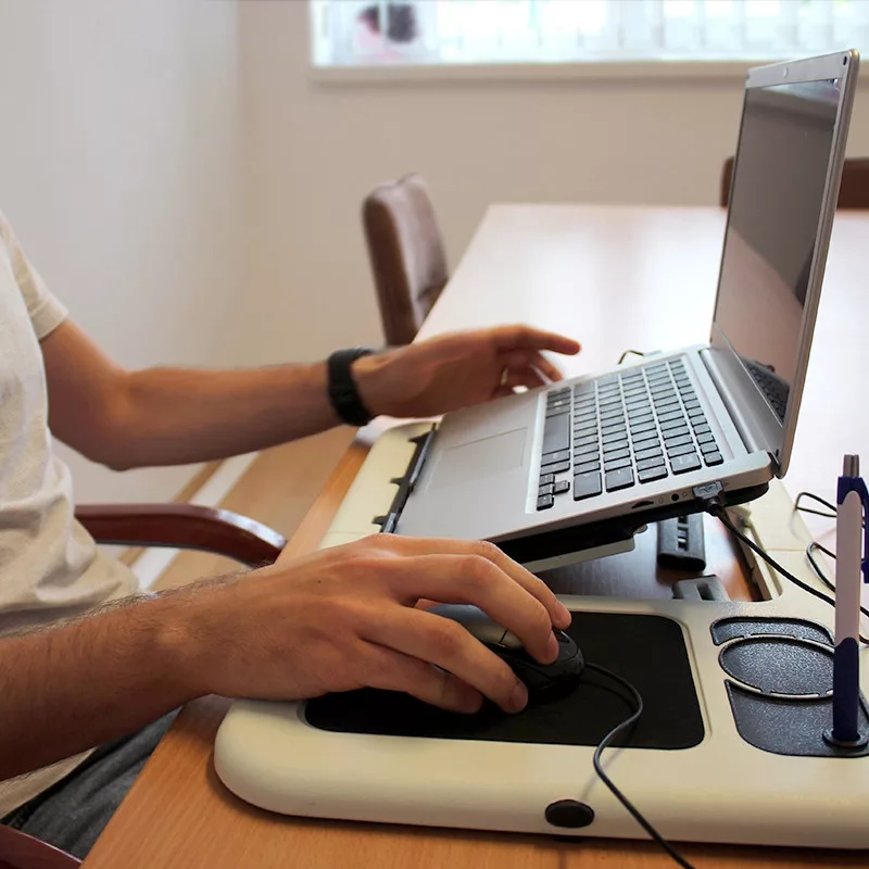 Realizat din materiale rezistente, masa îți menține laptopul stabil, oferind în același timp spațiu suplimentar pentru mouse, telefon mobil sau chiar o ceașcă de cafea. Orificiile de ventilație împiedică supraîncălzirea dispozitivului.