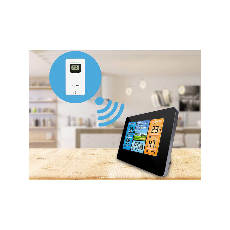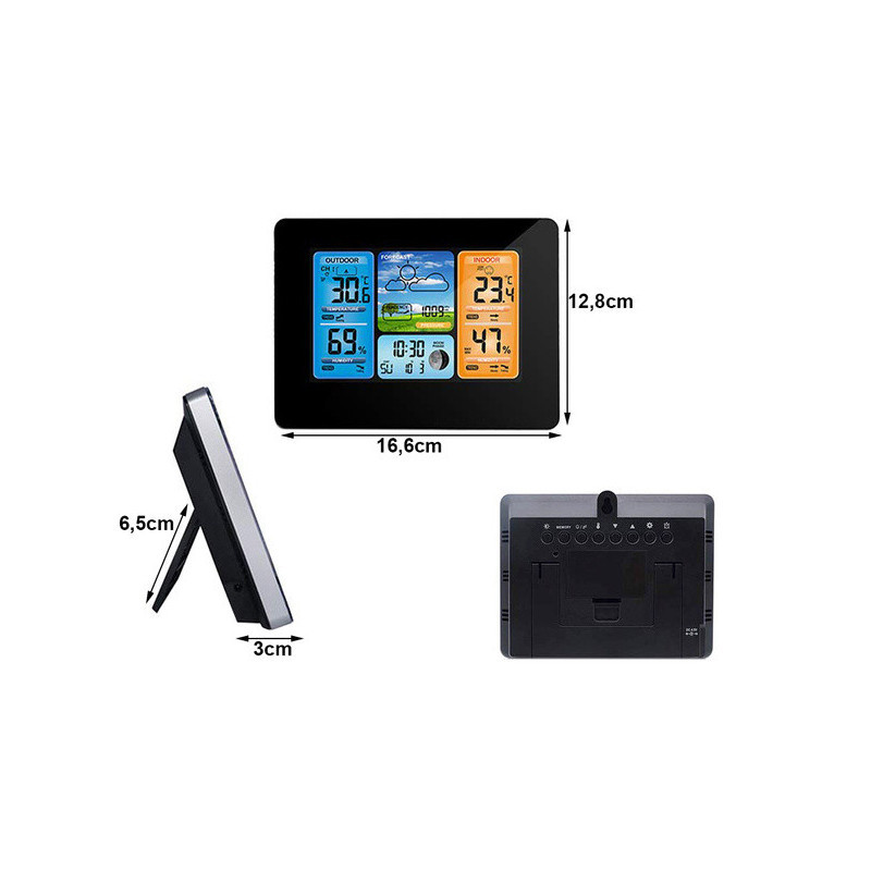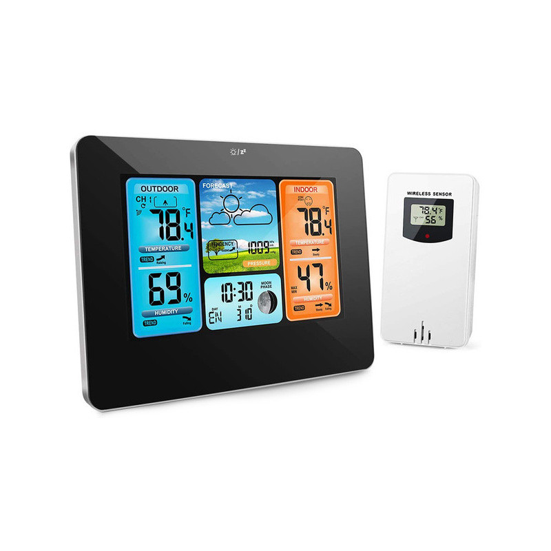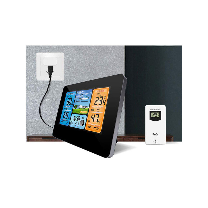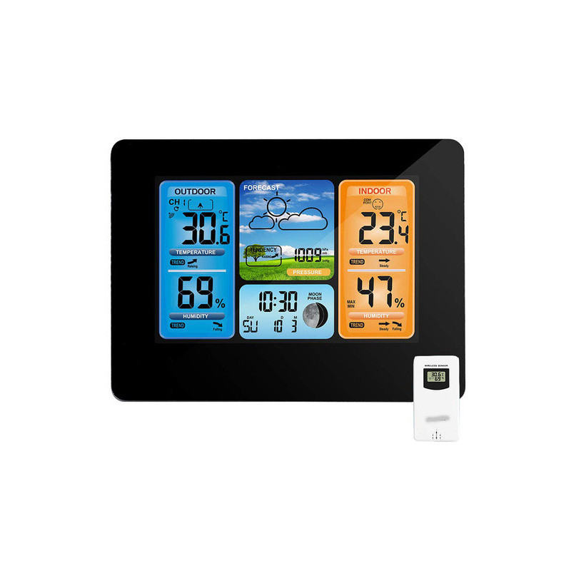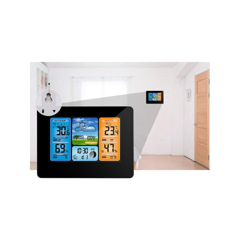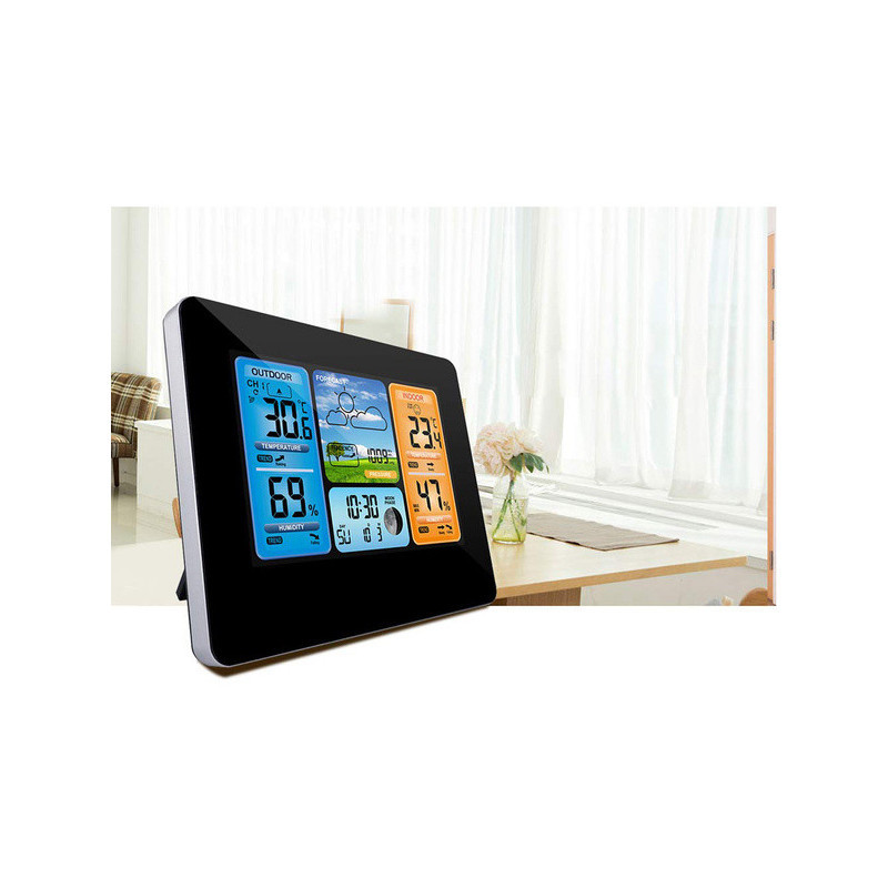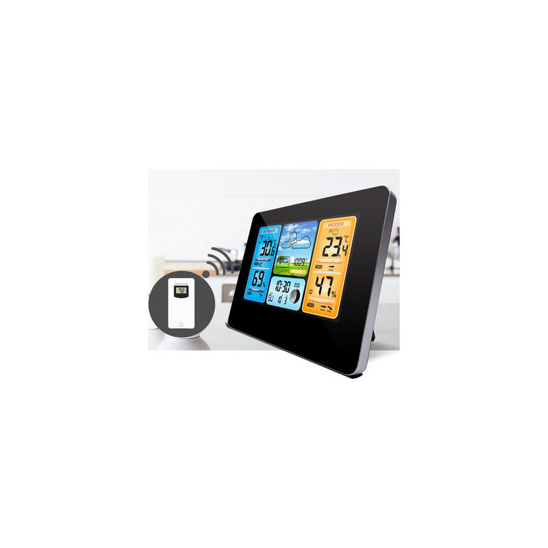 Această stație meteo modernă are un design elegant, care se potrivește perfect cu atmosfera oricărei camere. Poate fi amplasată oriunde, fie pe un dulap, pervaz sau masă, ba chiar poate fi agățată pe perete. Acest dispozitiv va fi cu adevărat util în multe case, deoarece este extrem de funcțional. Produsul ne arată temperatura actuală, umiditatea și presiunea atmosferică (actualizate în timp real). Vine cu un senzor extern, care are o rază de acțiune de până la 60 de metri. Funcționează cu două baterii LR6 AA, la fel ca senzorul, sau cu alimentare de la rețea printr-un cablu USB. Stația poate fi folosită și ca ceas, alarmă și calendar (cu data curentă și ziua săptămânii). Poți alege dintre 7 limbi. Dispozitivul arată temperatura și umiditatea atât în exterior, cât și în interiorul camerei. În plus, are un ecran LCD mare și clar, de pe care poți citi cu ușurință indicatorii interesanți. Stația afișează fazele lunii și dispune de o funcție de prognoză meteo.