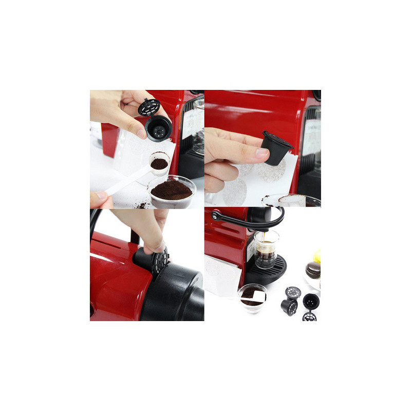 Aceste 5 capsule de cafea reutilizabile sunt visul oricărui iubitor de cafea! De acum, poți savura orice tip de cafea, ceai, ciocolată sau cacao, oricând dorești! Este o soluție mult mai economică decât cumpărarea de rezerve de unică folosință. Capsulele sunt foarte ușor de umplut cu produsul dorit. Pur și simplu deschizi capacul și torni cafeaua! Capacul se închide etanș și nu lasă lichidul să treacă. În interiorul capsulei se află un filtru din oțel inoxidabil, care împiedică pătrunderea bucăților de cafea sau ceai în ceașcă. Un pahar de măsurare este inclus în pachet, astfel încât să poți măsura exact cantitatea necesară de produs. După ce ai pus cafeaua, amestecă ușor și închide capacul. Apoi, introdu capsulele în aparatul de cafea. Capsula se potrivește perfect în orice model Nespresso. După ce cafeaua este gata, trebuie să clătești capsula sub jet de apă și să îndepărtezi eventualele resturi cu peria inclusă în pachet.