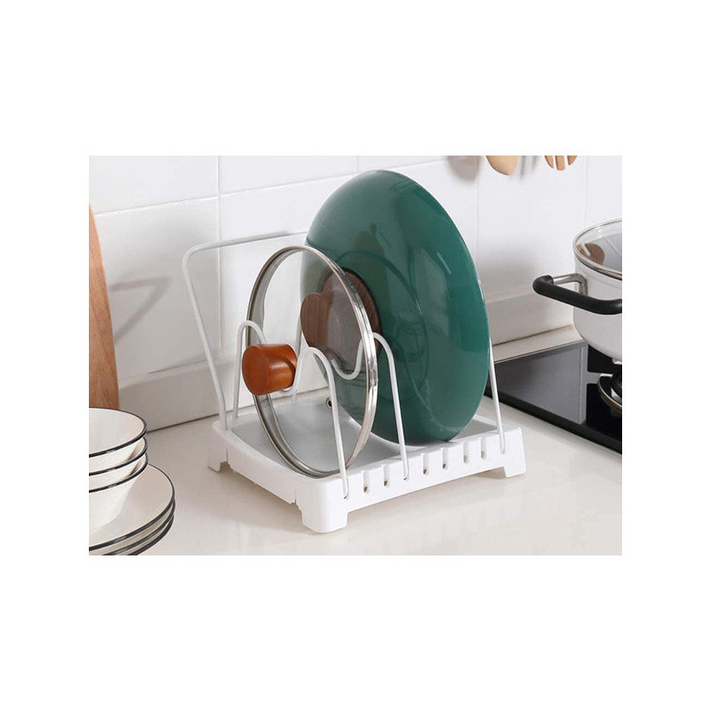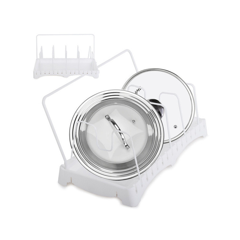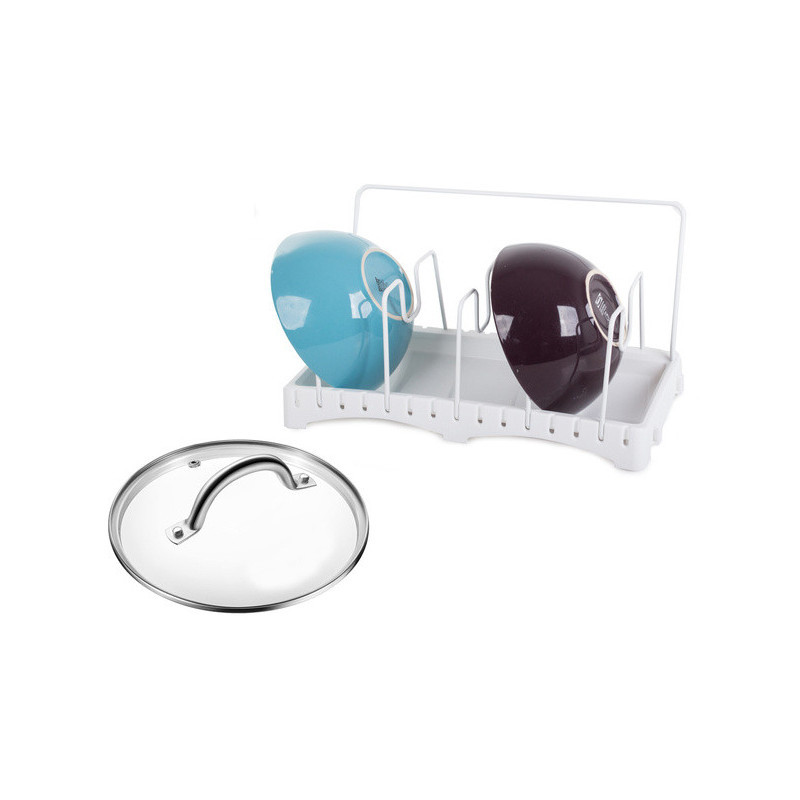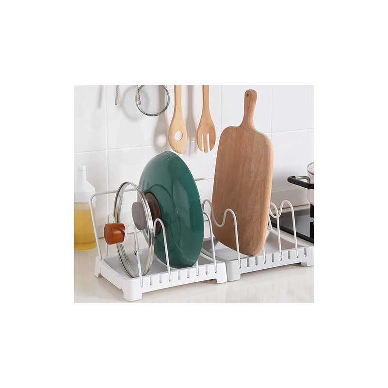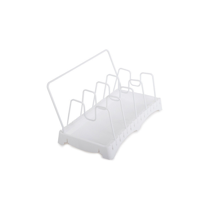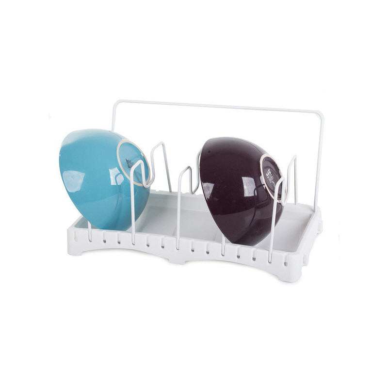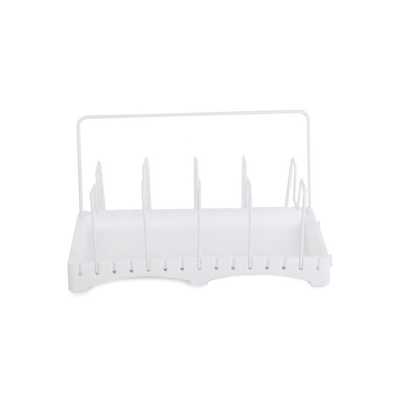 Suportul de uscare pentru organizarea accesoriilor de bucătărie îți permite să aranjezi diverse accesorii de bucătărie, precum capace de oale, tigăi, vase, tocătoare, farfurii, vase rezistente la căldură etc. Acest suport de uscare este echipat cu un sistem de scurgere, astfel încât accesoriile tale de bucătărie să se poată usca liber după spălare, înainte de a le pune în dulap. Suportul de uscare are 5 brațe mobile și ajustabile, pe care le poți configura după cum dorești. Poți crea compartimente mai mari sau mai mici. Suportul este curbat pe lungime pentru a preveni alunecarea accidentală. Poți folosi bara și ca suport pentru cârpe de bucătărie.