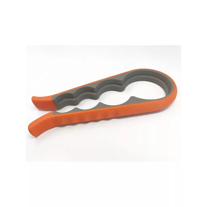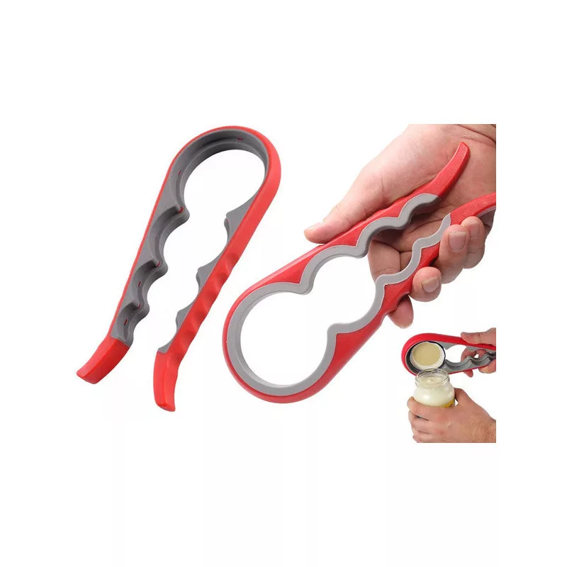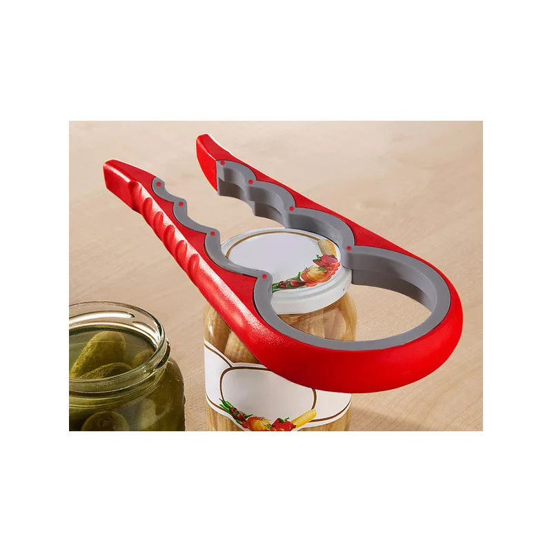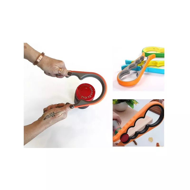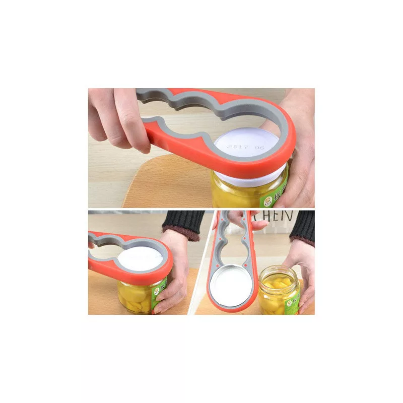 Deschizătorul este foarte ușor de folosit. Este dotat cu mânere cauciucate care se fixează strâns pe capac. Odată ce ai așezat deschizătorul pe capac, pur și simplu strânge și rotește încet pentru a deschide borcanul sau sticla. Deschizătorul are patru orificii de dimensiuni diferite pentru borcane și sticle.