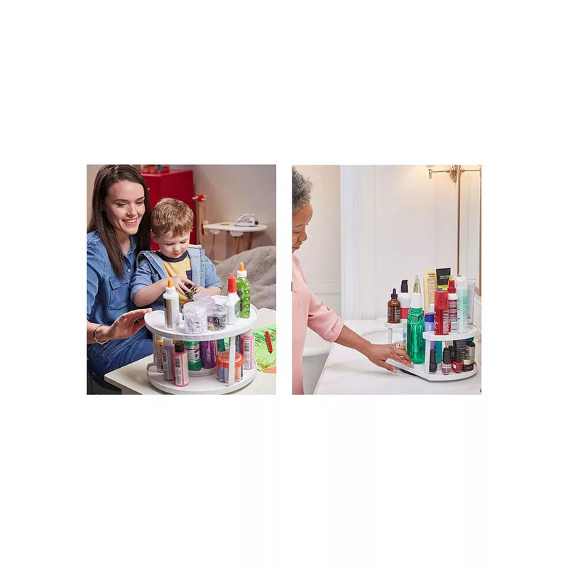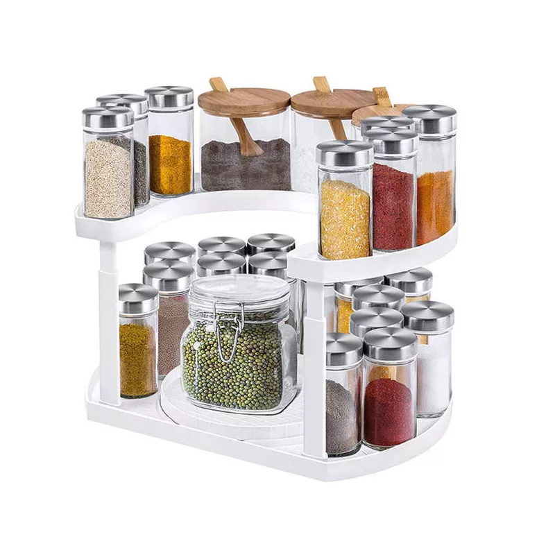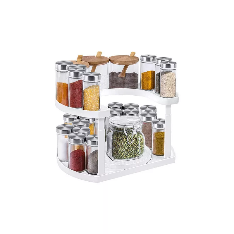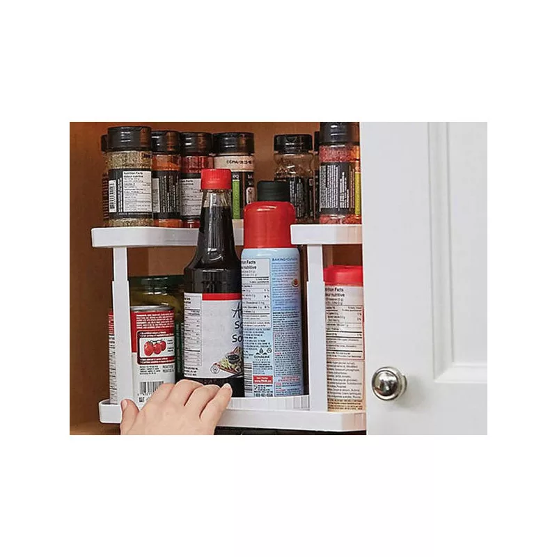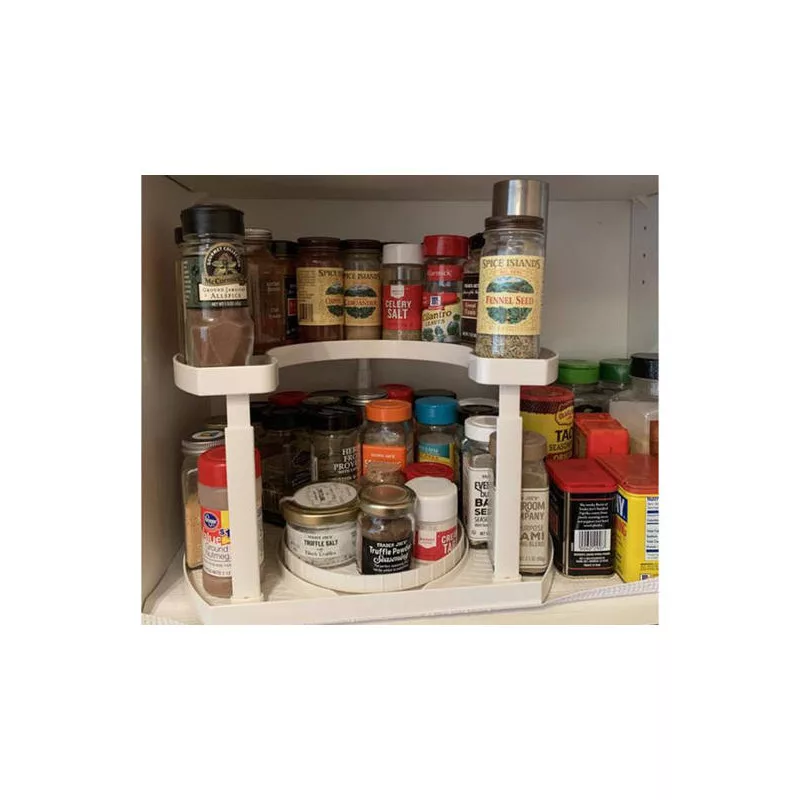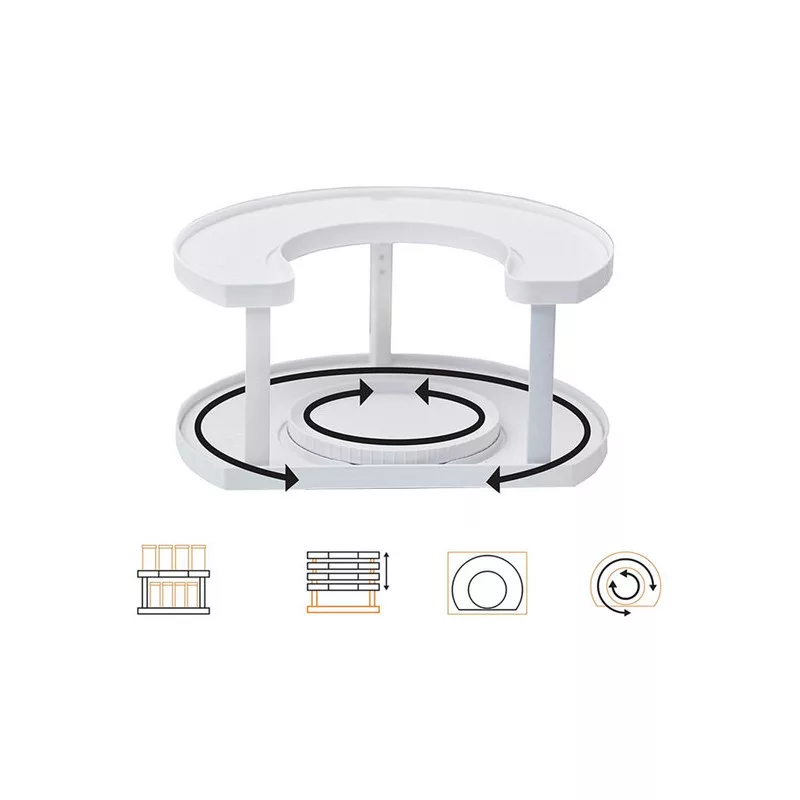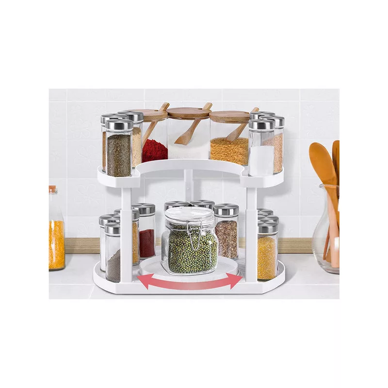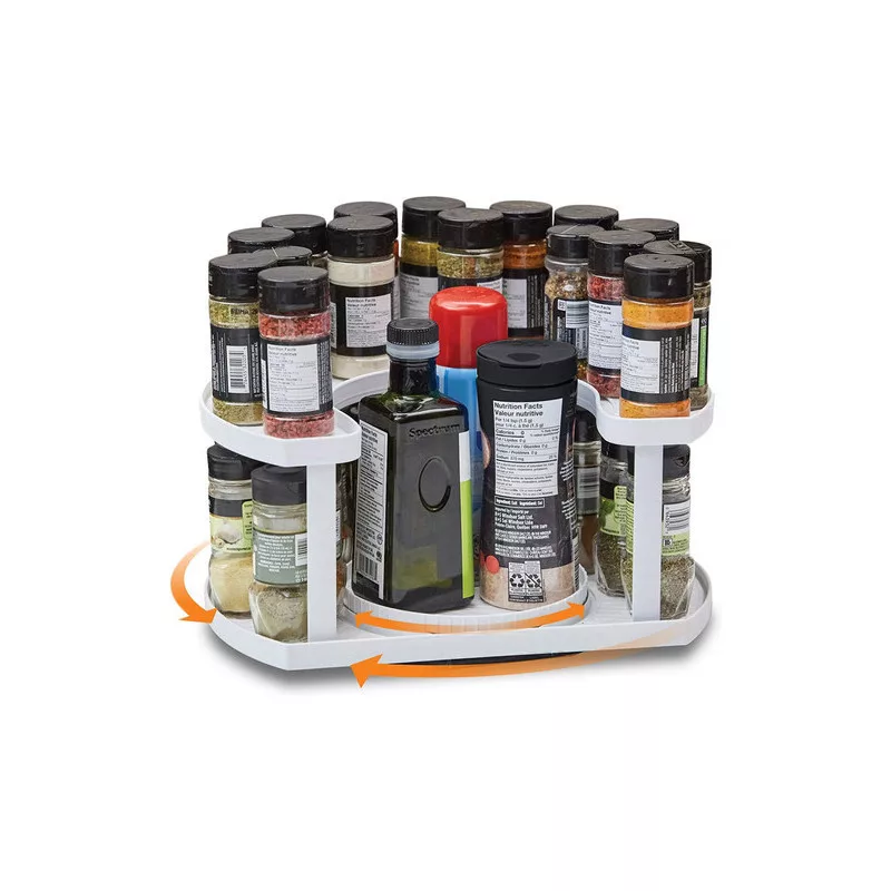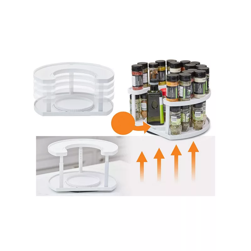 Suportul Rotativ pentru Condimente de Bucătărie este un accesoriu super practic pentru bucătăria ta! Poți accesa rapid și ușor condimentul dorit, iar raftul din mijloc este, de asemenea, rotativ! Înălțimea suportului poate fi ajustată între 17 cm și 20 cm, așa că se potrivește perfect în orice loc! Nu doar în bucătărie, dar și în baie sau pe masa de machiaj va fi de mare folos!
