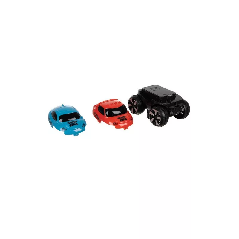 Setul include o mașină iluminată, alimentată cu baterii, pe care o poți folosi cu două cabine diferite: poți alege între roșu și albastru. Organizați curse și bucurați-vă de aventură!